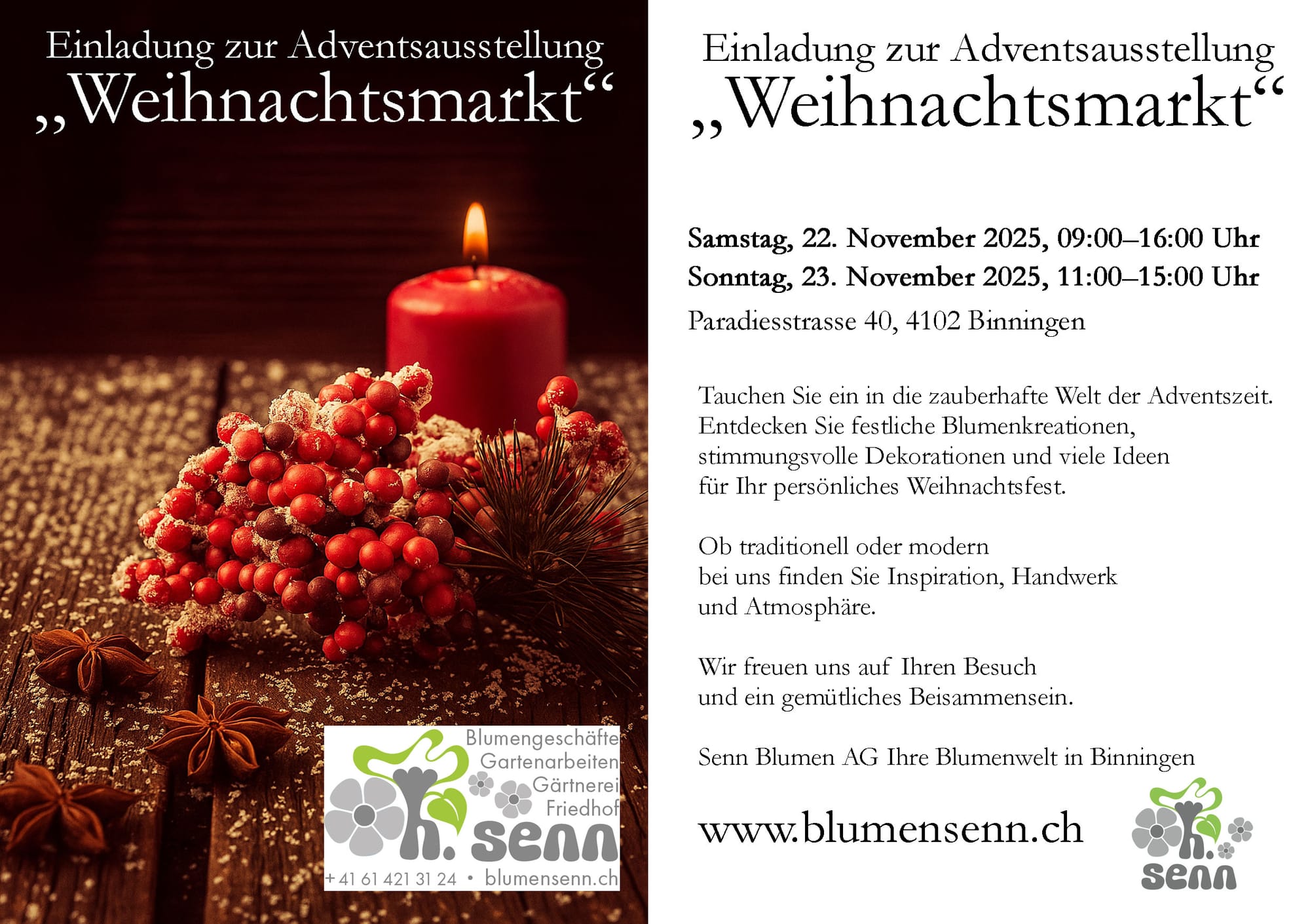 Tauchen Sie ein in die zauberhafte Welt der Adventszeit. Entdecken Sie festliche Blumenkreationen, stimmungsvolle Dekorationen und viele Ideen für Ihr persönliches Weihnachtsfest. Ob traditionell oder modern bei uns finden Sie Inspiration, Handwerk und Atmosphäre. Wir freuen uns auf Ihren Besuch und ein gemütliches Beisammensein. Senn Blumen AG Ihre Blumenwelt in Binningen www.blumensenn.ch